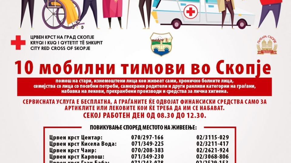 Во 15 градови формирани се мобилни тимови кои се активни секој ден и чија задача е да вршат неопходна набавка на лекови, прехранбени производи и средства за лична хигиена и истите да ги достават до домовите на старите, изнемоштени лица кои живеат сами, хронично болните лица, до семејства со лица со посебни потреби, самохрани родители и други ранливи категории на граѓани. Мобилните тимови се составени од лица од тимовите за одговор при катастрофи и обучени лица за давање основна медицинска помош. Сервисната услуга што ја обезбедуваат мобилните тимови е бесплатна, а граѓаните треба да одвојат финансиски средства само за артиклите или лековите кои ќе треба да им се набават. Целта на оваа активност е да им се овозможи поддршка на лицата на која таа им е најнеопходна, со што тие нема да имаат потреба да ги напуштаат своите домови и на тој начин да се намали ризикот од инфицирање со вирусот Ковид-19 (корона вирус).