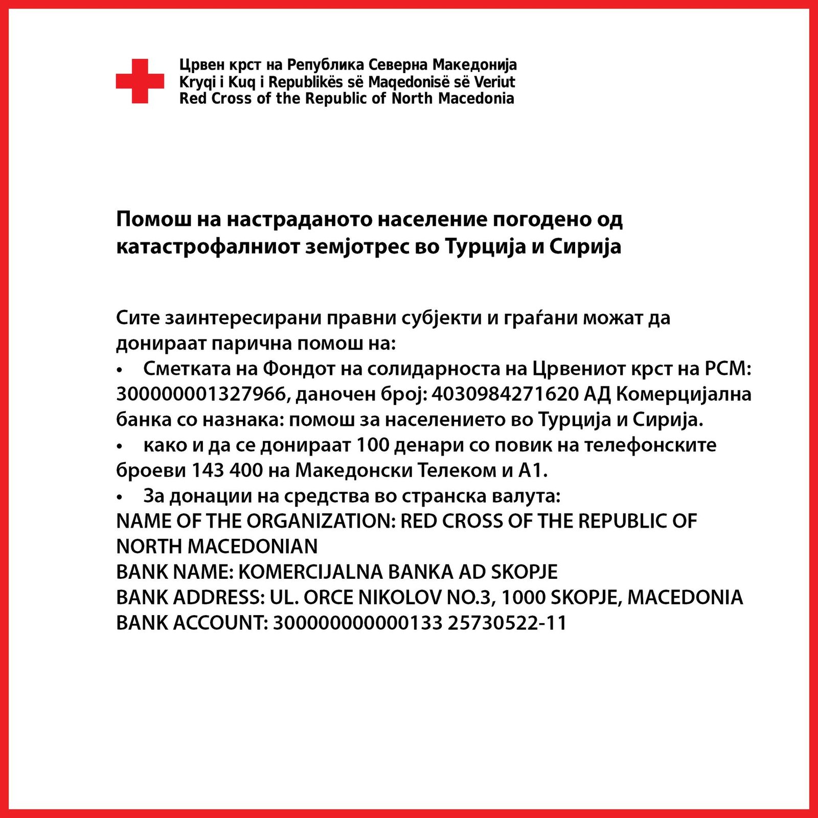 - Сметката на Фондот на солидарноста на Црвениот крст на РСМ: 300000001327966, даночен број: 4030984271620 АД Комерцијална банка со назнака: помош за населението во Турција и Сирија.