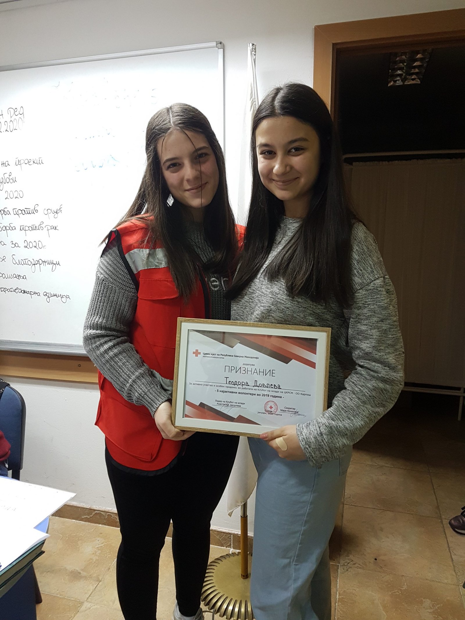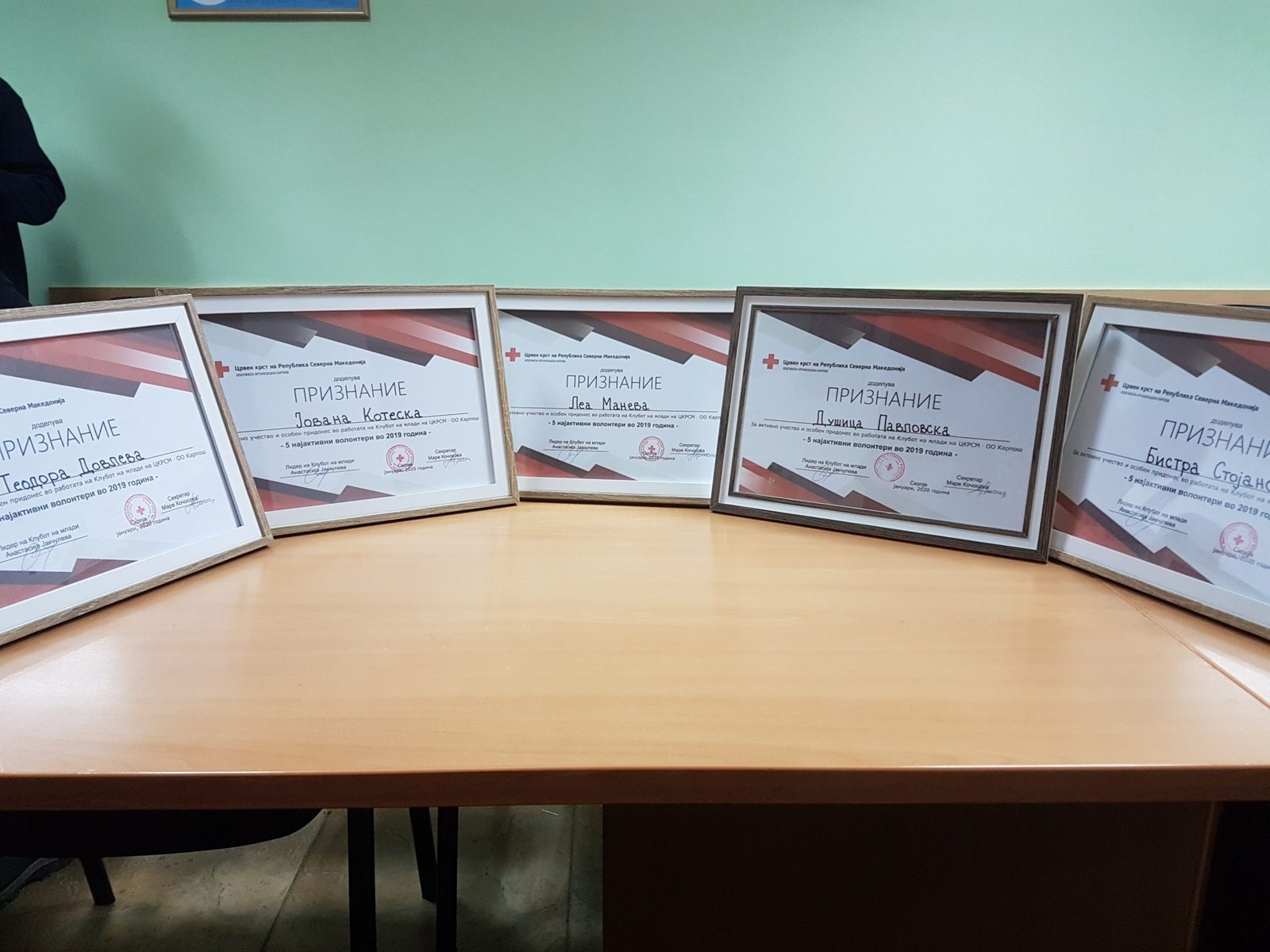 Со цел да се промовира волонтерството, да се зголеми видливоста на волонтерите и позитивните волонтерски практики и да се инспирира кон понатамошно унапредување и развој на волонтерството, Црвен крст на Република Северна Македонија-Општинска организација Карпош на 8 Февруари 2020 година додели Признанија на 5-те најактивни млади волонтери од Клубот на Млади на Општинската организација Карпош.