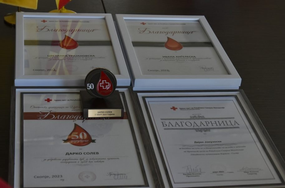 По повод одбележување на 17 Март-Ден на крводарителството во РСМ, Црвениот крст на Република Северна Македонија-Општинска организација Карпош во соработка со општина Карпош на 28 Март 2023 година организира заеднички настан за доделување на јубилејни признанија и благодарници на повеќекратни крводарители и истаканти мотиватори кои со својата хуманост дадоа огромен придонес во унапредувањето на крводарителството. На свечениот чин кој се одржа во општина Карпош, Градоначалникот на општината г-дин Стефчо Јакимовски додели Јубилејно признание за 50 крводарувања на Дарко Солев, благодарница за најмалд крводарител на Марко Дабески, а благодарници за придонес за мотивирање и успешно организирањето на крводарителските акциите на Цветанка Трајановска-педагог од СУГС “Георги Димитров”-Карпош, Мартина Самболец-психолог од СУГС “Здравко Цветковски”-Kарпош, Тања Неделковска и Ивана Анѓелеска од Клиничка болница Аџибадем Систина и Дејан Јонузоски вработен во локална самоуправа Карпош.
