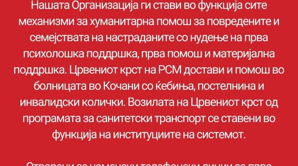 Нашата Организација ги стави во функција сите механизми за хуманитарна помош за повредените и семејствата на настраданите со нудење на прва психолошка поддршка, прва помош и материјална поддршка. Црвениот крст на РСМ достави и помош во болницата во Кочани со ќебиња, постелнина и инвалидски колички. Возилата на Црвениот крст од програмата за санитетски транспорт се ставени во функција на институциите на системот.
