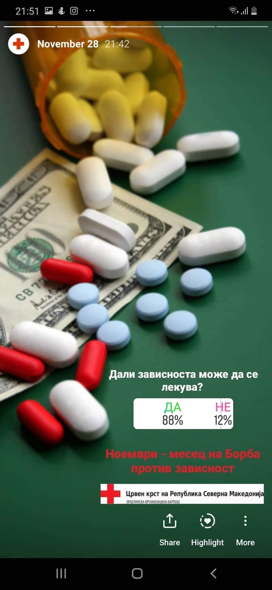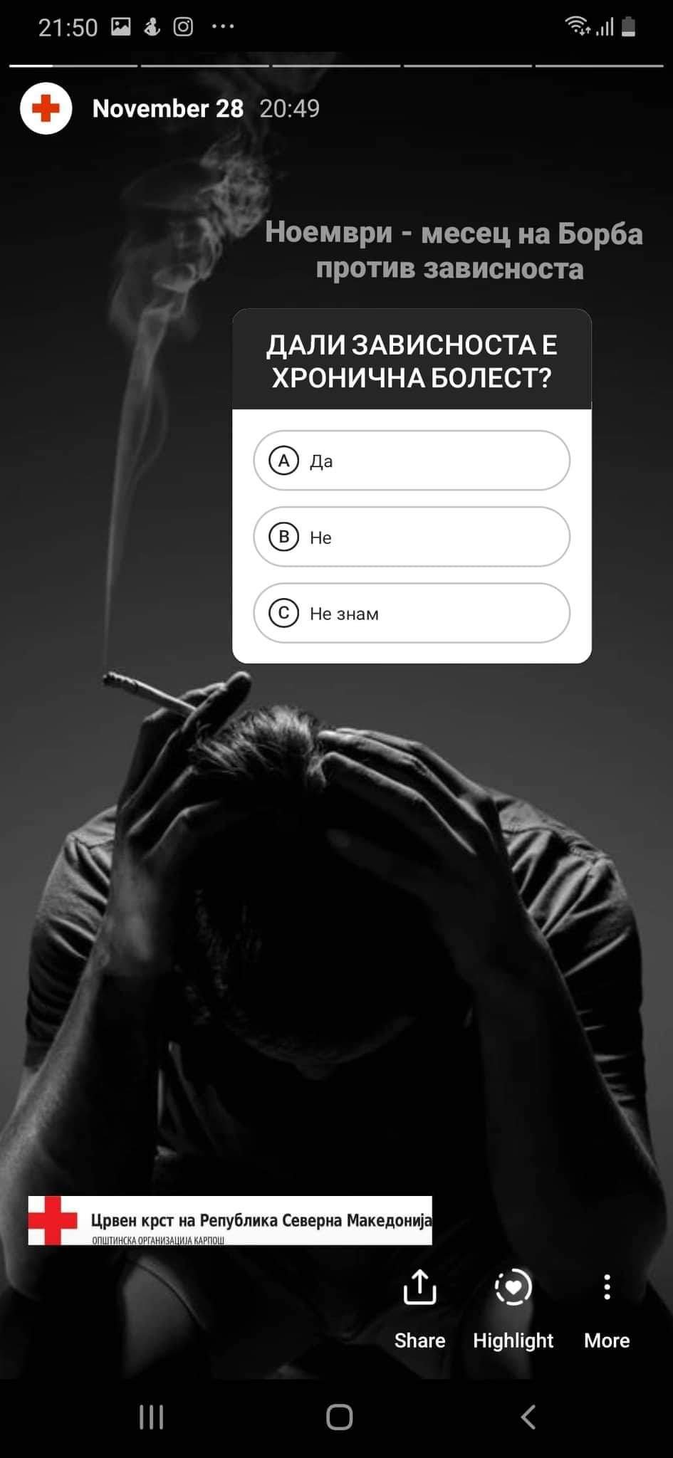 По повод одбележувањето на Месецот на борба против болестите на зависност, Клубот на млади на ЦКРСМ-ОО Карпош организираше алтернативна online активност преку реализирање на квиз на Instagram профилот. Целта на квизот беше да се подигне свеста за потребата од превенција, како и проширување на знаењата од областа на болестите на зависност.