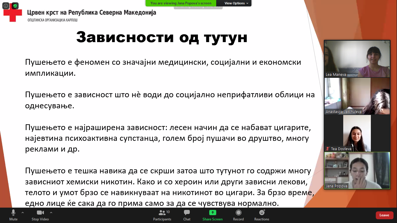На 15 јуни 2020 година со користење на ZOOM апликација се реализираше едукација на тема „Превенција од болести на зависност“ за 21 волонтер од Клубот на млади на Општинската организација Карпош.