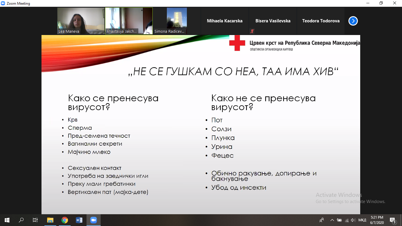 На 13 јуни 2020 година со користење на ZOOM апликацијата вкупно 22 волонтери од Клубот на млади на Општинската организација Карпош имаа можност да ги надградат своите знаења на темата „Превенција од сексуално преносливи болести“.