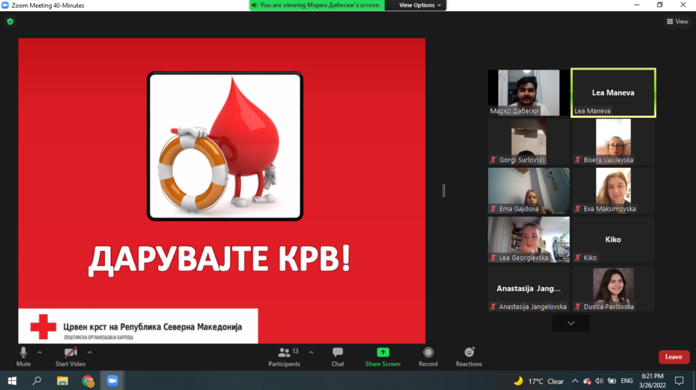 Во рамките на активностите за унапредување и промовирање на крводартелството, Црвен крст на Република Северна Македонија-Општинска организација Карпош на 26 март 2022 година реализира online едукација за вклучување на младите во доброволното крводарување.
