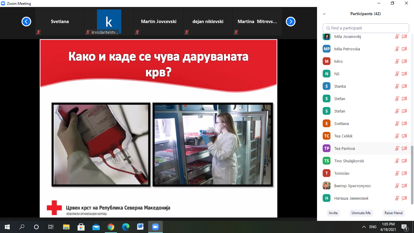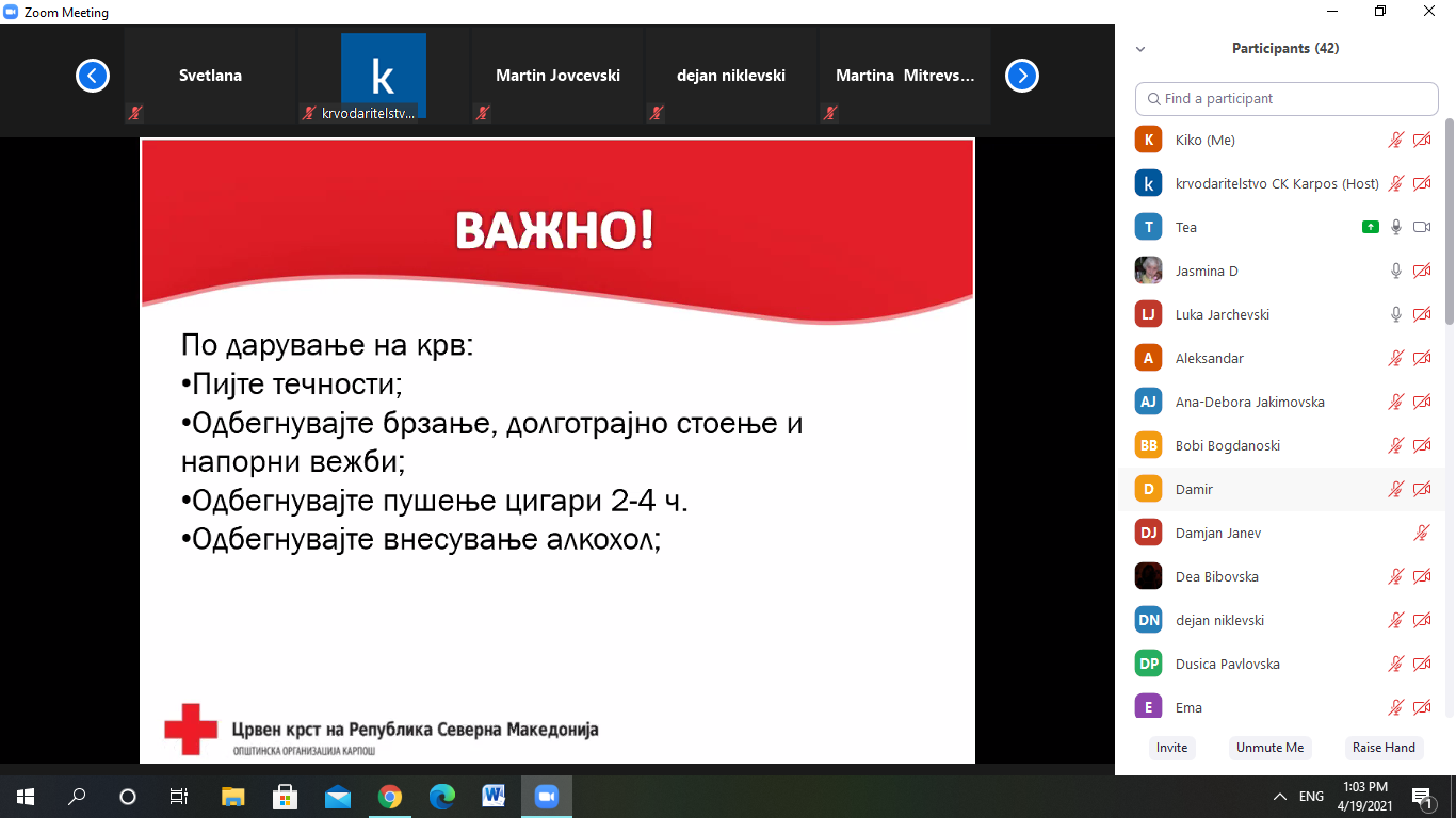Црвен крст на Република Северна Македонија – Општинска организација Карпош во месец април 2021 година се посвети на едукација и мотивација на учениците од завршните години во средните училишта да стекнат основни информации за крводарителството и да станат потенцијални крводарители.