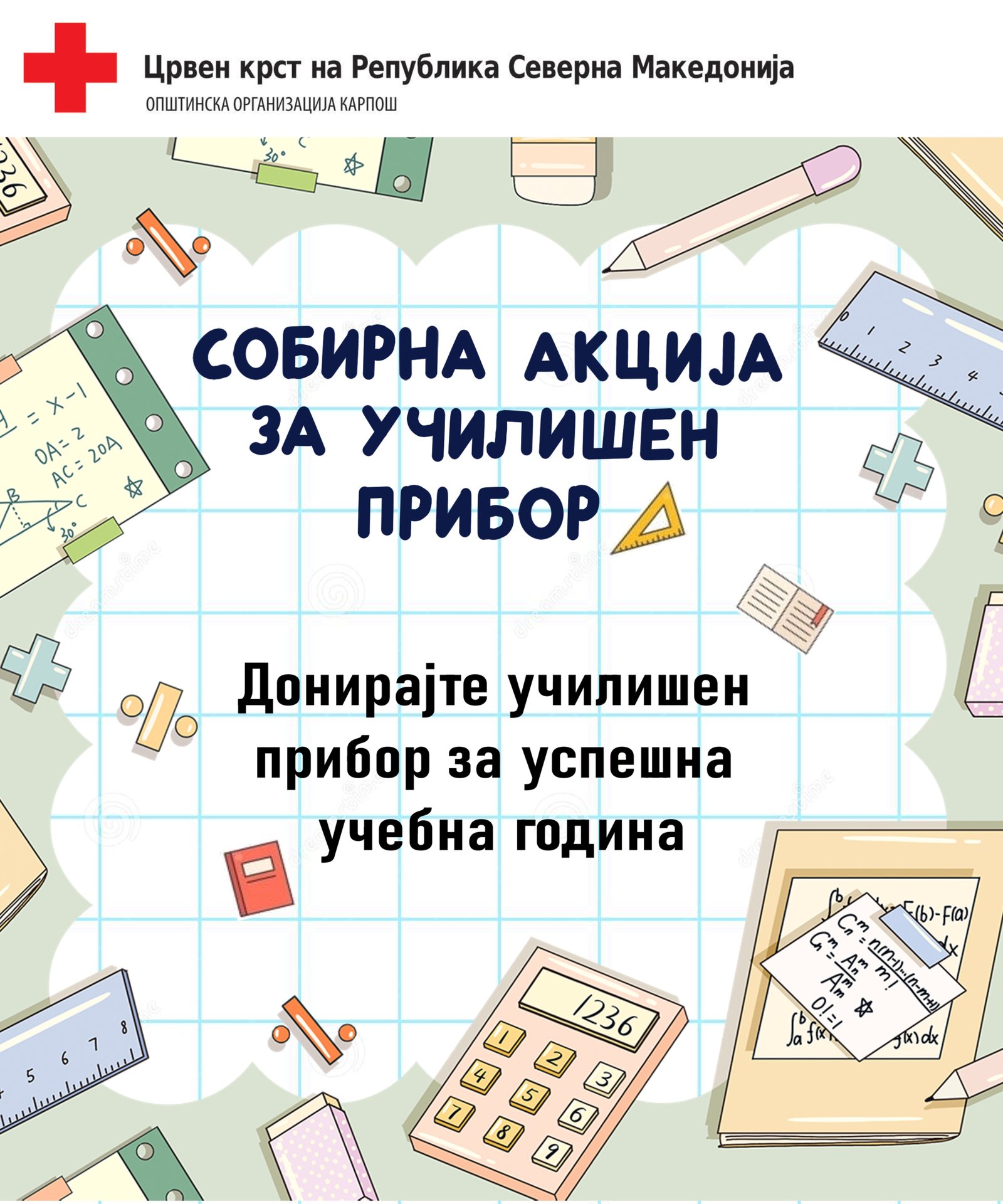 Клубот на млади на Црвен крст на РСМ – Општинска организација Карпош во периодот од 14 до 20 септември 2022 година спроведе собирна хуманитарна акција за собирање на училишен прибор. Со цел промовирање на акцијата беше изработен и промовиран информативен плакат. Во наведениот период беа собрани 560 парчиња училишен прибор кој беше спакуван во 40 комплети. Комплетите со прибор беа поделени на 40 деца од семејства во социјален ризик со цел ублажување на ранливоста за време на почетокот на учебната година. Во акцијата учество земаа ученици од ООУ„Петар Поп Арсов“-Скопје, членовите и волонтерите на Клубот на млади и граѓани.