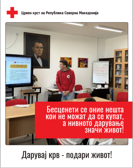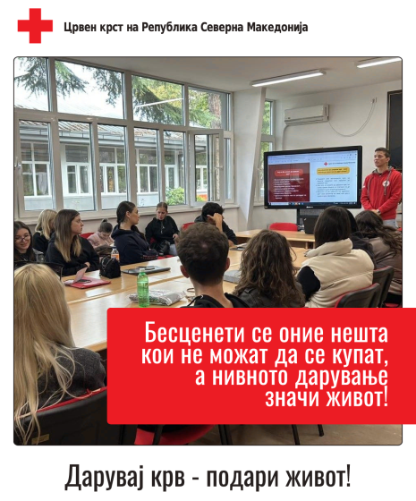 Во рамки на активностите за унапредување и промовирање на крводарителството, Црвениот крст на Република Северна Македонија – Општинска организација Карпош во месец септември 2025 година спроведе две врснички едукации на кои присуствуваа 42 млади лица, ученици во трета и четврта година од СУГС „Кочо Рацин“.
