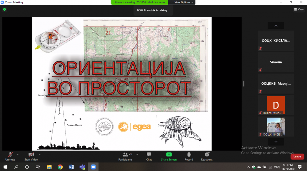 На ден 19.11.2020 г. беше реализирана обука за „Ориентација во простор“ организирана од Здружението на млади географичари на Природно-математичкиот факултет преку електронската платформа zoom.