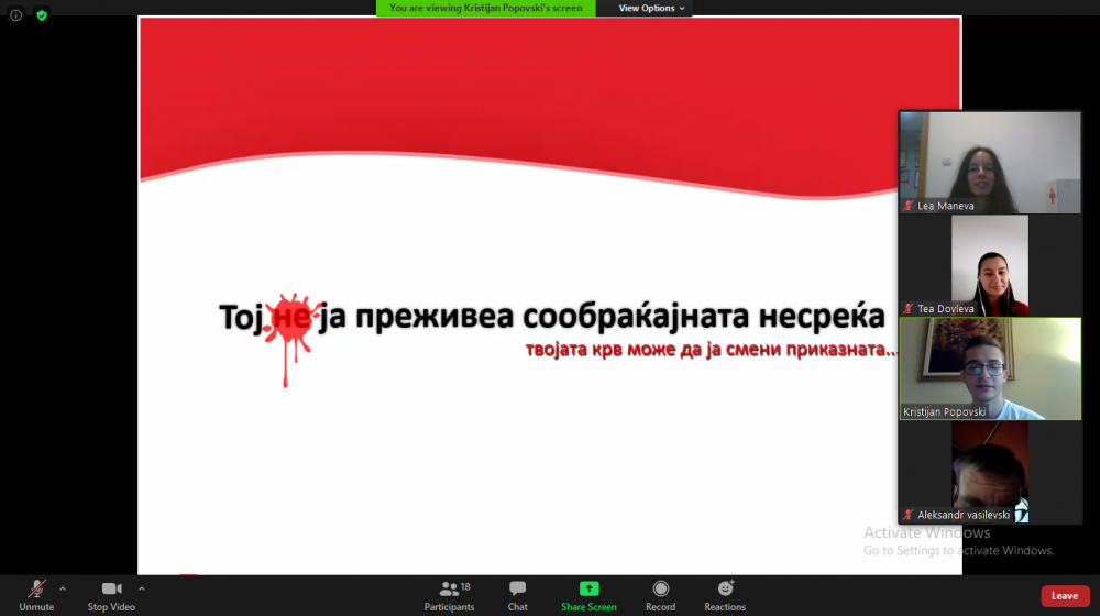 Со примена на алтернативните платформи за електронско предавање преку користење на ZOOM апликацијата, а со цел мотивирање на млади потенцијални крводарители (над 17.5 години), на 19 август 2020 година Клубот на млади на ЦКРСМ-ОО Карпош организираше онлајн врсничка едукација на тема Крводарителство.